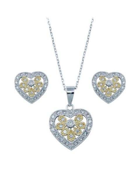 PARIKHS Rhodium Plated Multi Colored Heart CZ Necklace-Earring Set in 925 Sterling Silver