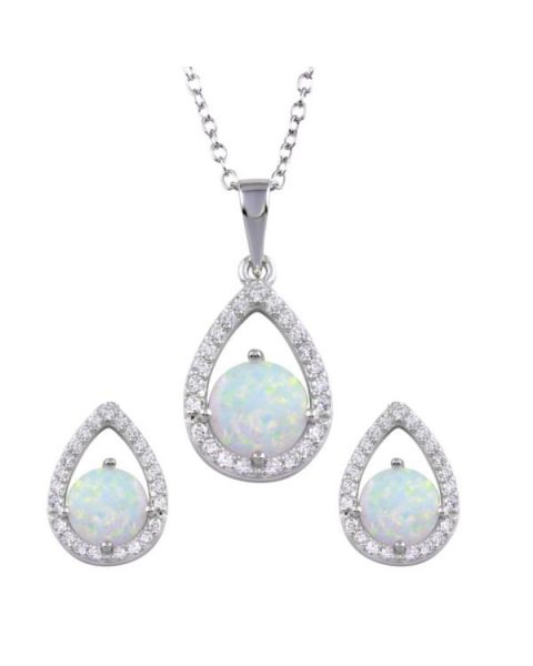 PARIKHS Rhodium Plated Synthetic Opal Open Teardrop CZ Necklace-Earring Set in 925 Sterling Silver