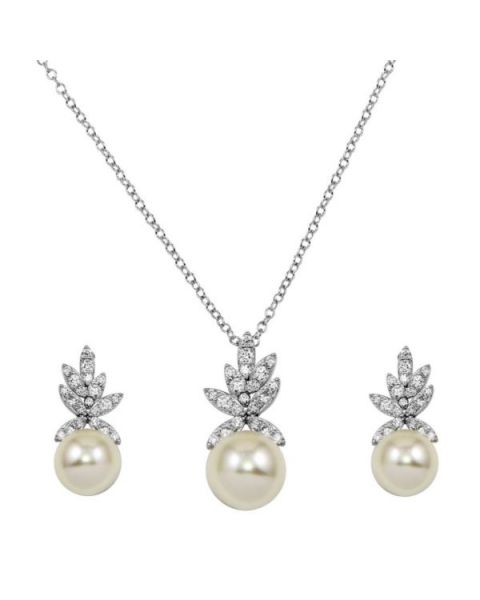 PARIKHS Rhodium Plated CZ Leaves with Synthetic Pearl Necklace-Earring Set in 925 Sterling Silver
